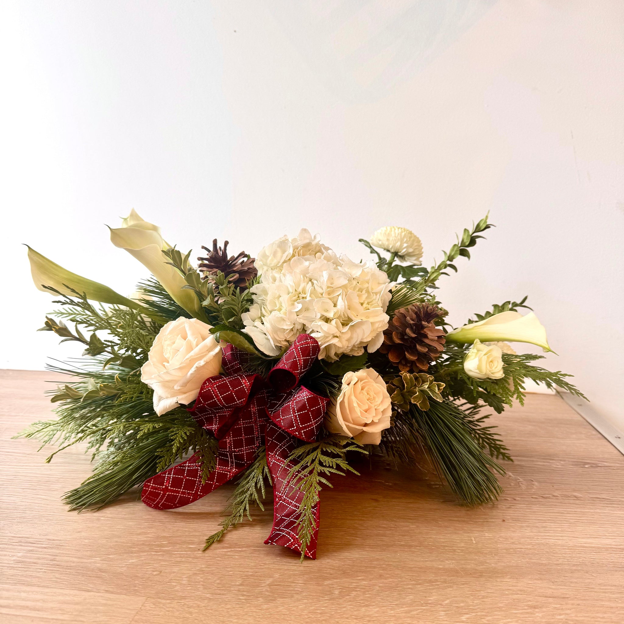 This mostly white traditional centrepiece of roses and winter greens, presents a modern twist with the addition of beautiful white calla lilies. Accented with a touch of sparkly ribbon, it would make the perfect gift.