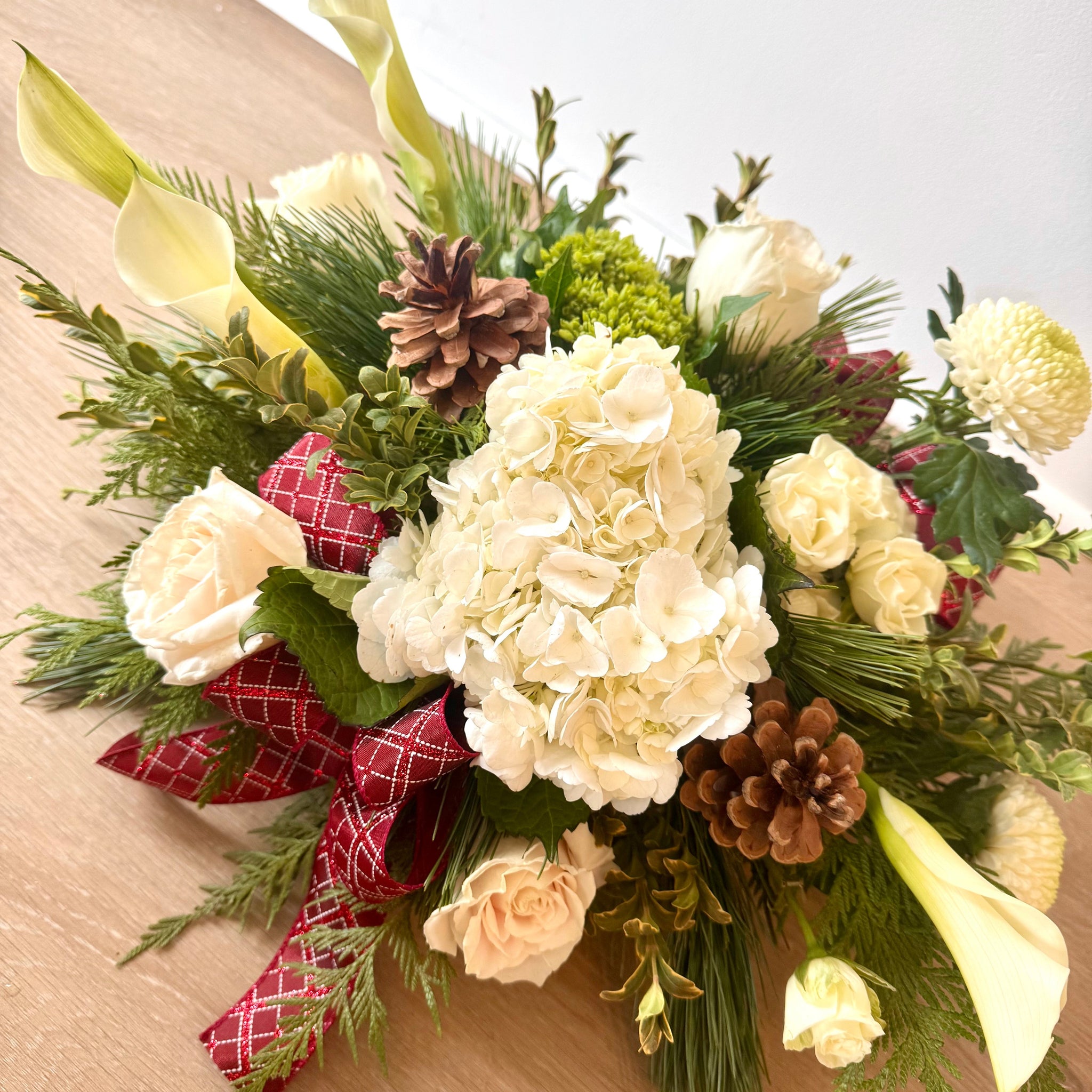 Due to rapidly changing availability for the Christmas season, substitutions may be made if specific flowers as shown are no longer available.