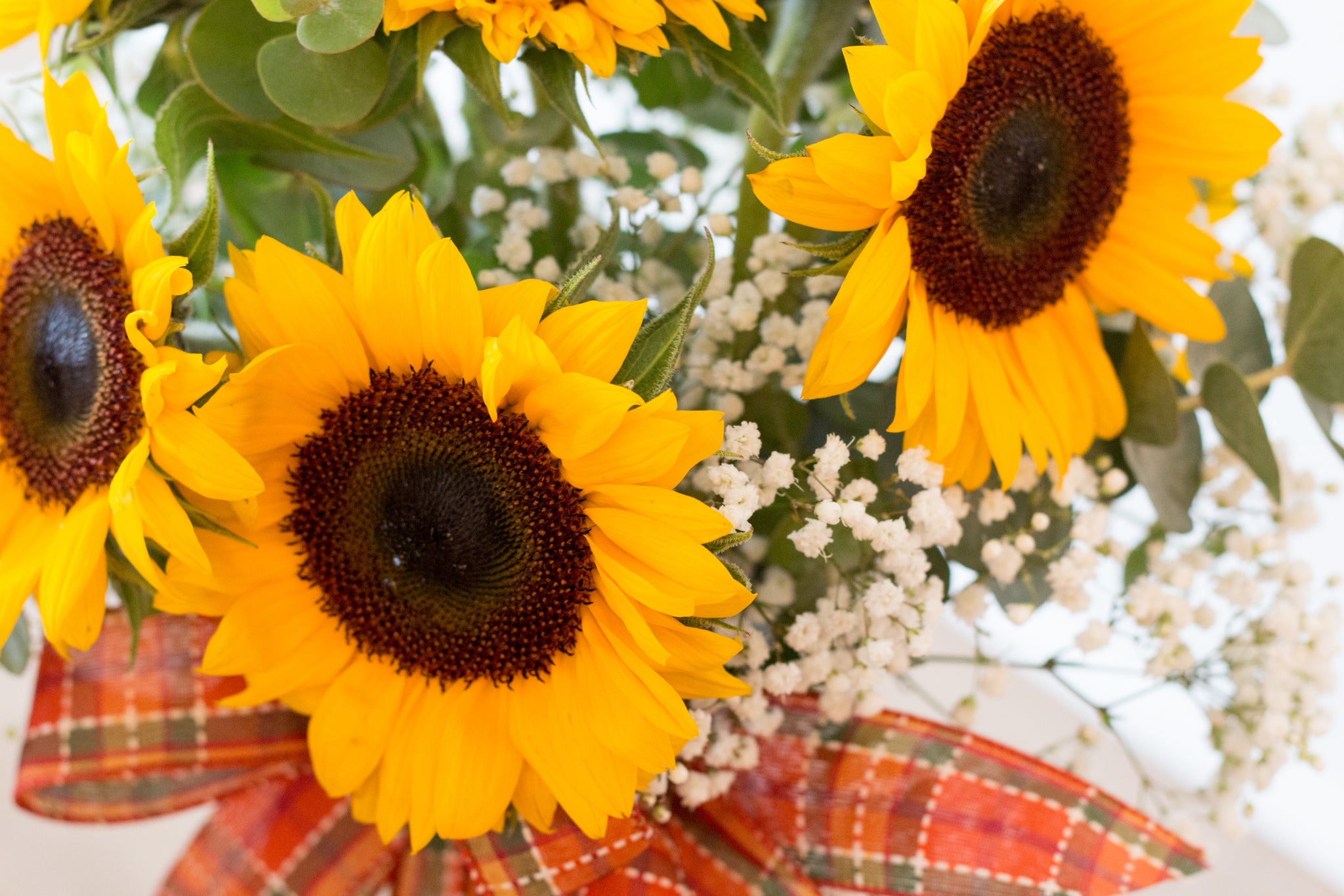 Nothing says fall like a bouquet of sunflowers. These ones are featured in a vintage look hobnail vase and accented with babys breath and eucalyptus.