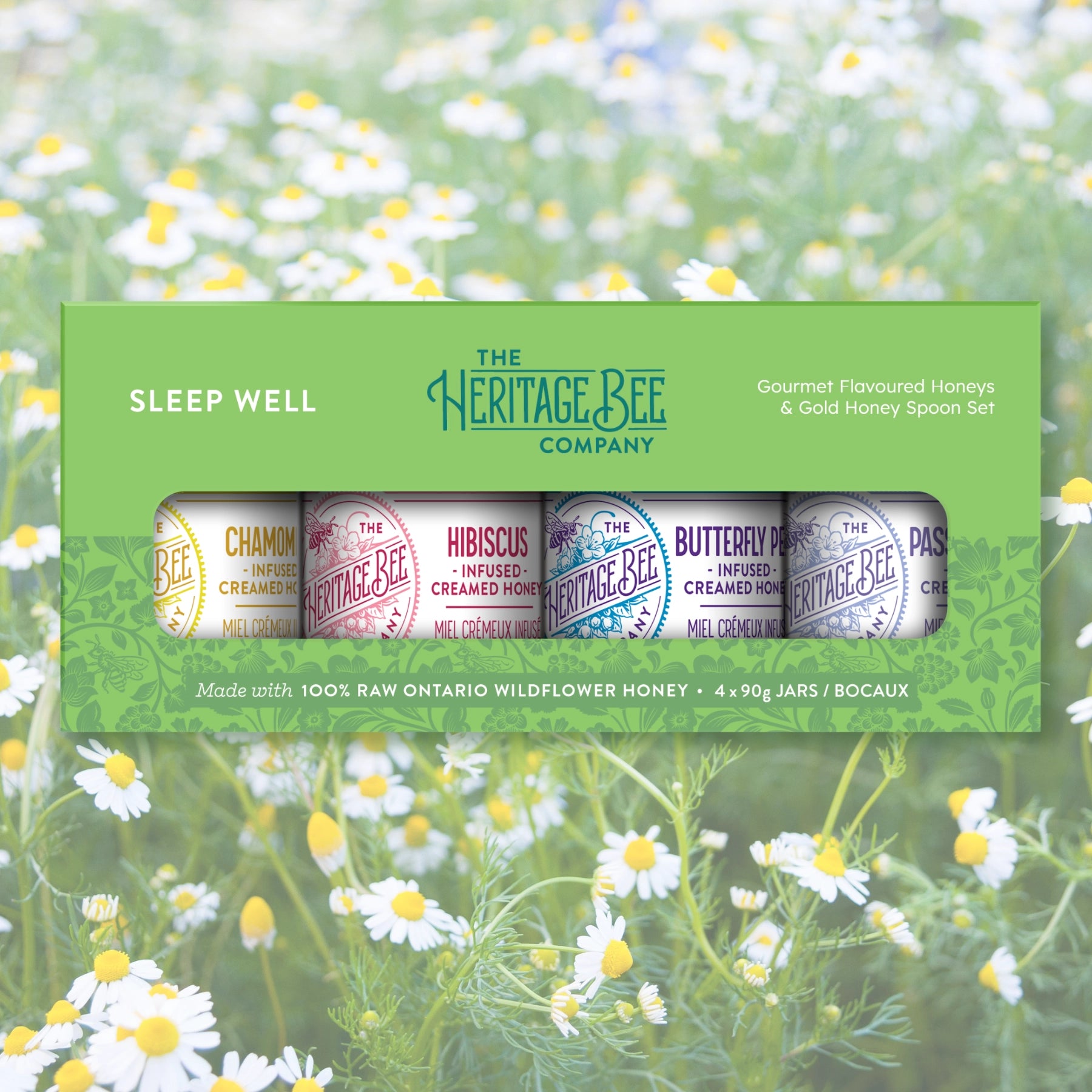 Each SLEEP WELL Gourmet Honey Gift Set Includes 4 jars: CHAMOMILE / HIBISCUS / BUTTERFLY PEA / PASSIONFLOWER and a gold spoon.